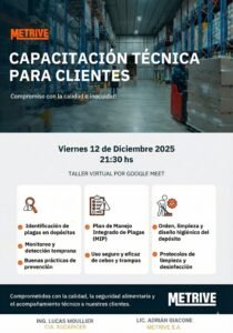 Santiago del Estero, 11 de diciembre de 2025 – En un firme compromiso con la excelencia, la inocuidad y la seguridad en la cadena de distribución de alimentos, Metrive anuncia la realización de una Jornada de Capacitación Técnica Virtual. El evento se llevará a cabo el próximo viernes 12 de diciembre de 2025 a las 21:30 hs a través de la plataforma Google Meet.